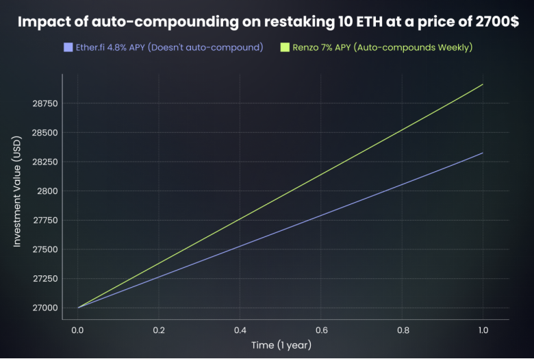 Renzo 的重要差异化优势在于 ezETH 自动复利质押和再质押奖励,与其他再质押协议相比,此机制会随着时间增加用户的回报。自动复利的质押和再质押奖励允许用户无需手动领取,节省了宝贵的gas费用。